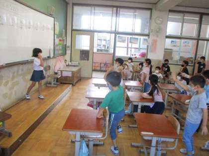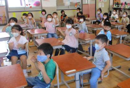 今日の外国語は,体の部分の名前を知ろうでした。聞きなれない言葉も多く言いづらいようでしたが,歌を歌いながら少しずつ覚えました。最後にじゃんけんをして盛り上がりました。