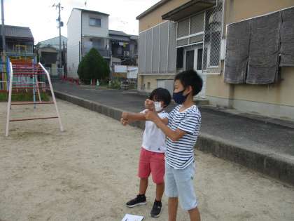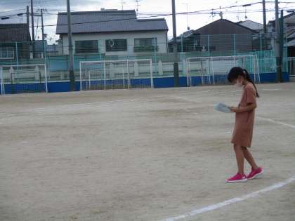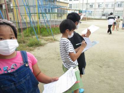 運動場で見える半月は,こぶし何個分の位置にあるのか,観察カードに記録しています。