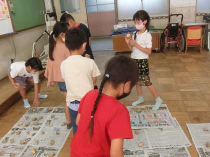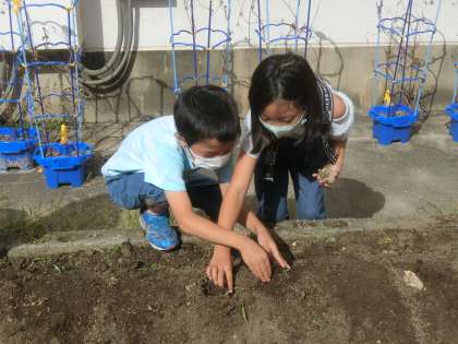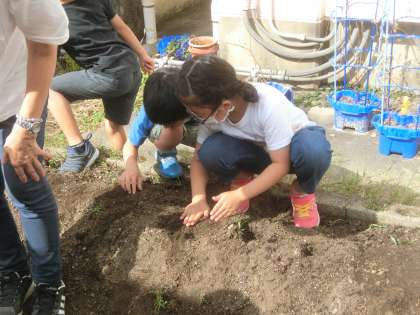花壇に,じゃがいもを植えました。じゃがいもからのびた,芽をじっくり見ていました。