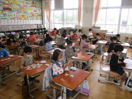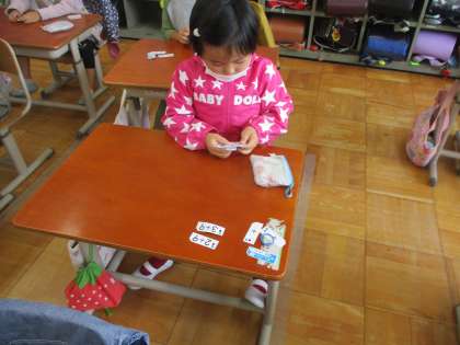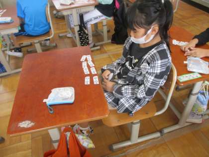 たしざん(2)の学習で,計算カードを使って学習をしています。今日は,11,12,13が答えになるカードを探して並べました。
