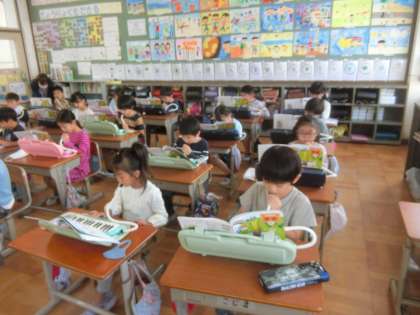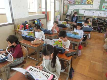 2年生の音楽では,久しぶりに鍵盤ハーモニカを演奏しました。これまでキーボードで練習してきた成果を発揮し,みんなで合わせて演奏できました。