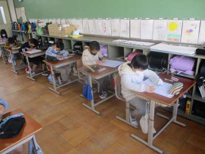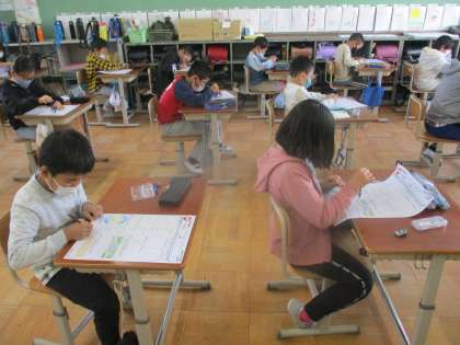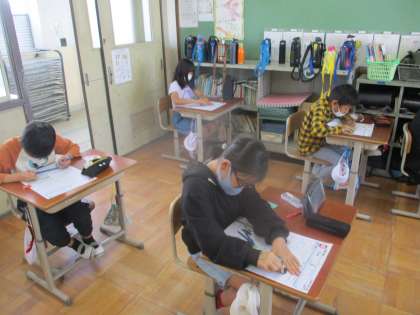 「円と球」の単元のまとめテストを行っている様子です。