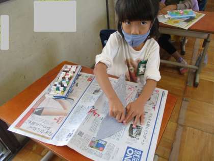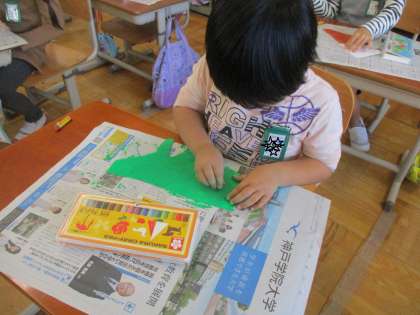 「いろいろなかたちのかみから」の学習をしました。いろいろな形の紙の向きをかえながら何の形に見えるかを想像しました。そしてそのものに見えるように色を描いたり模様を付けたりしました。