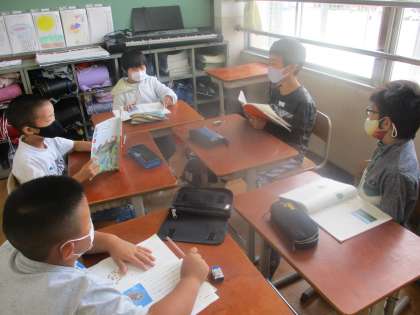 どの段落からどの段落までが「はじめ」,「中」,「終わり」なのかを班で話し合っている様子です。