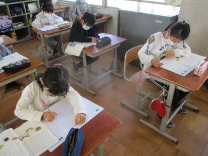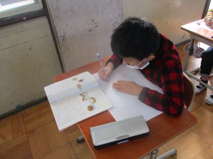 はじめ,中,終わりにどのようなことが書かれているかをワークシートにかいている様子です。