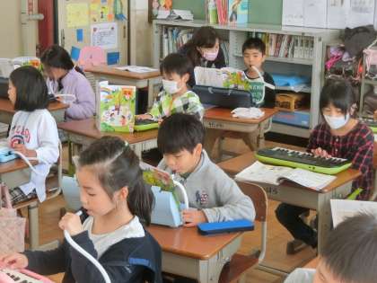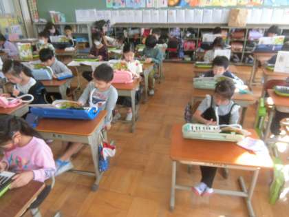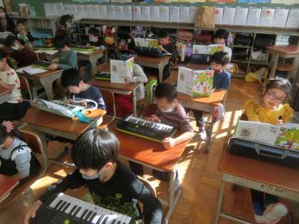 今日の音楽では,休符に気を付けて演奏しました。休符で全員の音が止まると,喜んでいました。