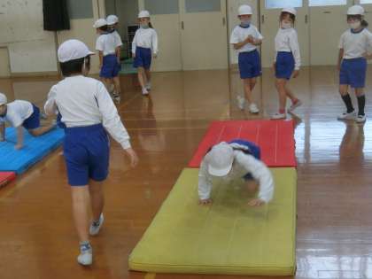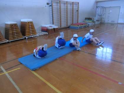 マット遊びをがんばっています。まっすぐ回れるように,これからも練習していきます。