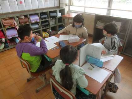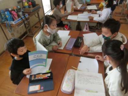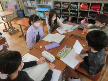 「そうだんにのってください」の学習では,班のメンバーの相談にのりました。兄弟への誕生日プレゼントのアイデアをもらったり,読書の時間に読む本についてのアドバイスをもらったりしました。