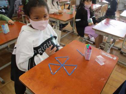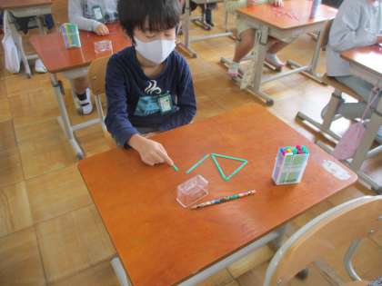 今日は,数え棒を使って形作りをしました。何本使うのか,どうつなげるのかを考えて作ることができました。