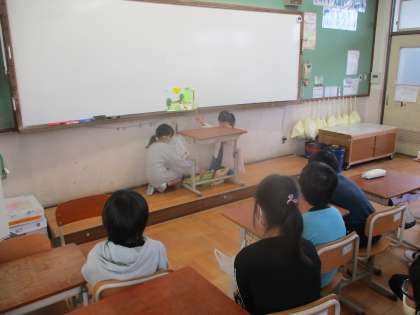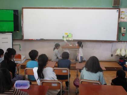 本係さんがペープサートを使って読み聞かせをしている様子です。