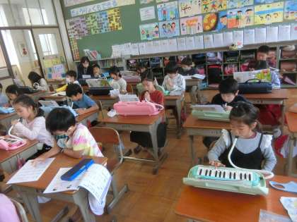 2年生の音楽では「山のポルカ」と「かねのおと」の練習をしています。指番号に気をつけながら,練習をすすめます。