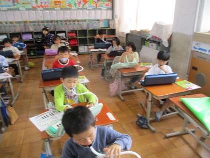 初めて鍵盤ハーモニカを使って学習をしました。今日は,鍵盤ハーモニカを使うときの約束事や吹き方などを学習しました。いろいろな音が出て楽しそうでした。