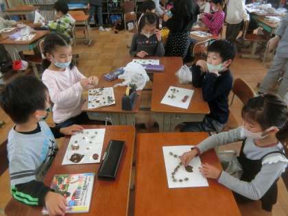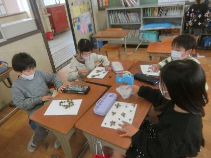 2年生の生活科では,秋見つけで見つけた落ち葉やドングリを使って,かざりを作りました。色や大きさがさまざまな落ち葉を使い,すてきなかざりができました。