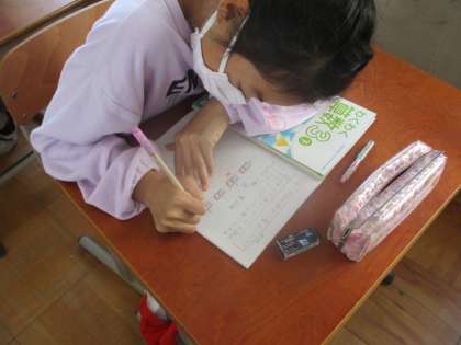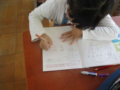 自分の考えをノートに図や言葉を使って書いている様子です。