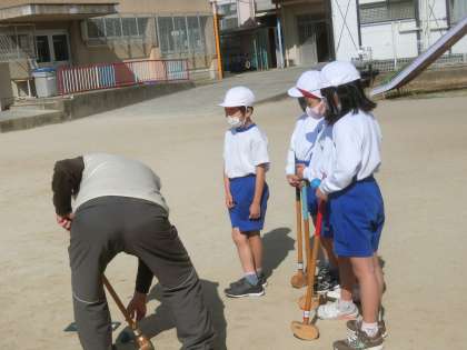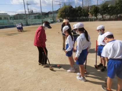 地域の方に教えていただき,グラウンドゴルフの体験をしました。初めてグランドゴルフをする子がほとんどで,始めはなかなかうまくいかず,苦戦しながらの活動でした。