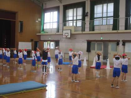 今日でマットあそびの学習は終わりです。はじめの体操を体育係がしてくれました。