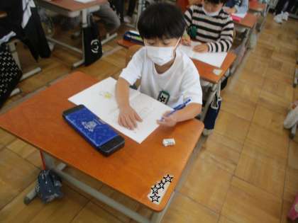 「かん字のはなし」の学習です。漢字のもとになった簡単な絵が混じった文を見て,漢字に変換して文を完成させる学習をしました。絵から文を読むことはできましたが,その漢字がどんな漢字だったのかで少し悩む姿が見られました。「竹」や「雨」は難しいようです。