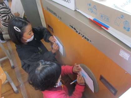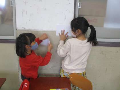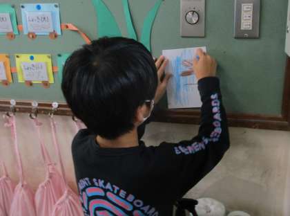 「でこぼこはっけん」の学習です。教室や校内のでこぼこしているところを見つけて紙に写しました。いつも何気なく使っているものや通っているところにたくさんのでこぼこがあって,写してみると面白い形がいっぱいでした。夢中で写して楽しみました。