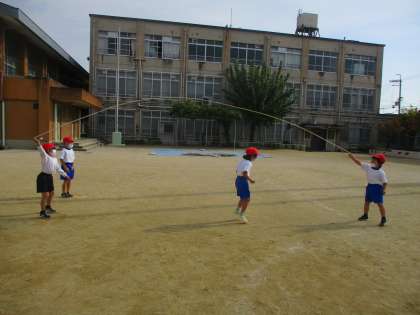 大縄跳びをしました。大波小波も上手になりました。今日は,さらに回した縄に入って一度跳ぶことにチャレンジしました。少しずつ慣れてきているようです。