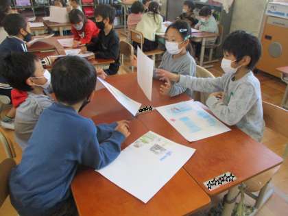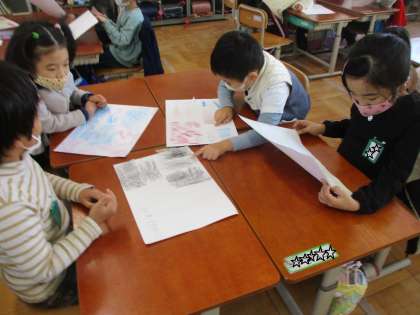 「でこぼこはっけん」の作品をお友だちと見せ合いました。どこのでこぼこかを考えたり,自分の作品と比べたりして鑑賞しました。