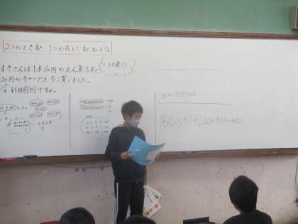 ( )を使って1つの式にあらわす方法を話し合ったり,あらわし方について説明している様子です。