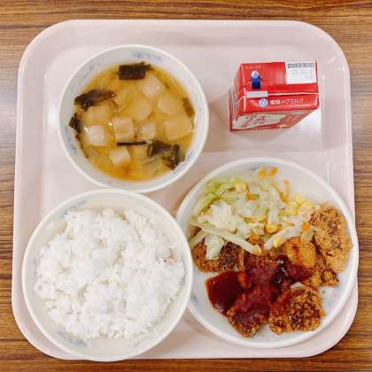 ヒレカツは給食室で1枚ずつ味付けし,油で丁寧に揚げます。