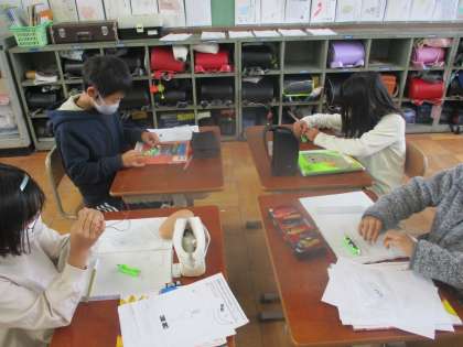 乾電池に明かりがつくときとつかないときのつなぎ方を調べている様子です。