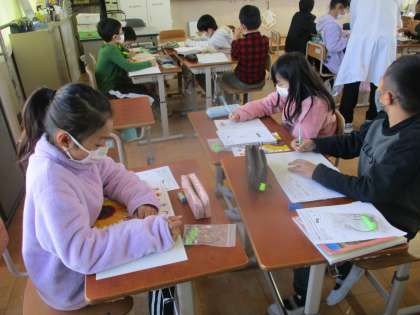 かん電池と豆電球を導線でどのようにつなげると明かりがつくかをまとめている様子です。