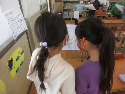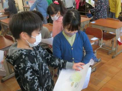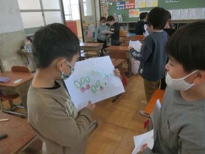 出来上がったサラダカードを,ペアで紹介しあいました。サラダのタイトルや,内容を全部英語で言うことができ,とても満足そうでした。