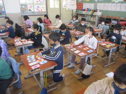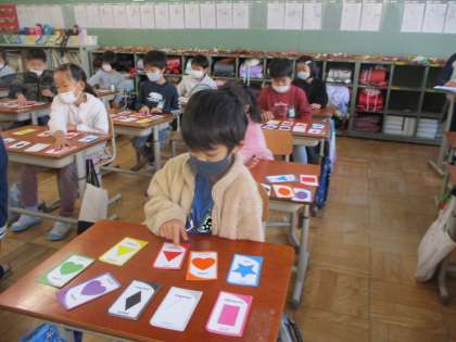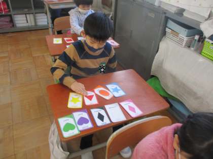「色の言い方」の学習をしました。カードを使って2種類のゲームをしました。先生に言われた色のカードを指で押さえるゲームと,先生が言った3種類の色を覚えてカードを並べるゲームをしました。3つの色を順番に覚えるのはちょっぴり難しかったようです。
