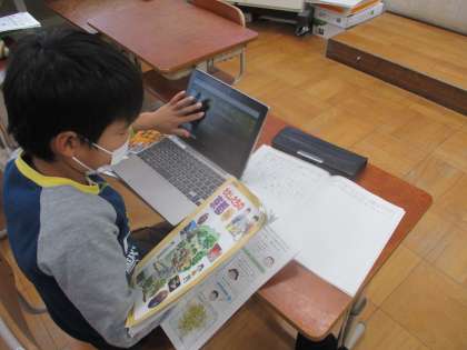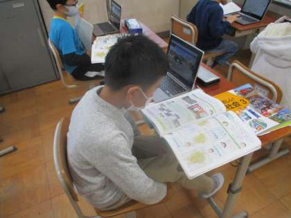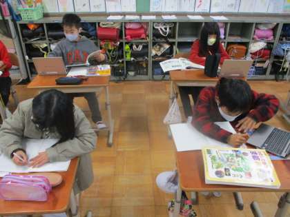 タブレットや教科書の資料を使って京都市の様子のうつりかわりを調べている様子です。