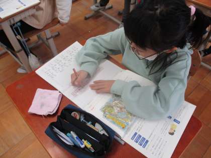地図を見て,宝物までの道のりやどのような動物に出会うのかを想像してノートにかいている様子です。