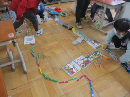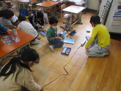 「ならべてならべて」の学習です。身の周りにあるものを使って,ならべて形を作りました。まずは,教室にあるものを使って並べました。数え棒やえんぴつ,ブロックなどを使って長く長くつないでいました。