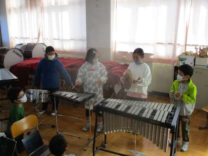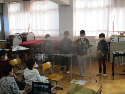 グループで考えた「まほうの音楽」を友だちに発表している様子です。