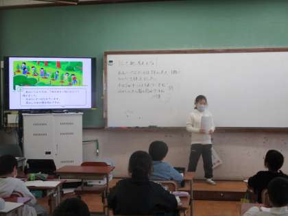 自分の考えを図を使って説明している様子です。
