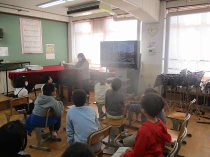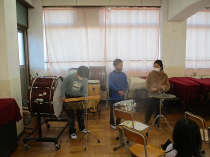 グループで考えた「まほうの音楽」をいろいろな楽器を使って発表したり,動画を見て自分たちの発表を確認したりしている様子です。