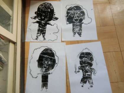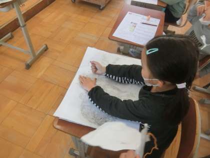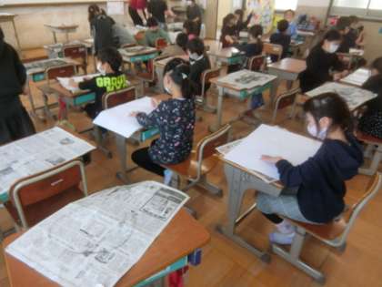 楽しくうつしての学習では,紙版画を刷りました。これまで,大切に作ってきた紙版画にインクをつけて,刷りました。きれいに刷ることができ,とてもうれしそうでした。