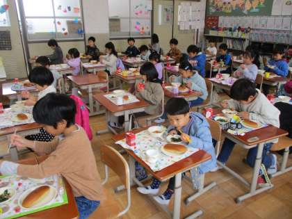 今年初めての給食は,黒糖コッペパン,ほうれん草のソテー,大豆と鶏肉のトマト煮でした。久ぶりの給食に自然とにこにこになっていました。おいしくいただきました。