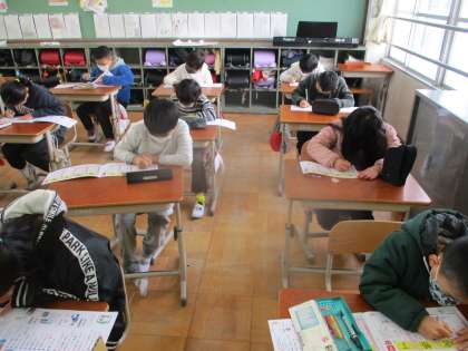 漢字ドリルに新出漢字漢字を書いている様子です。