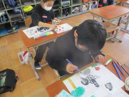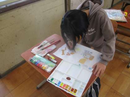 すった版画の作品を絵の具でぬって作品作りをしている様子です。
