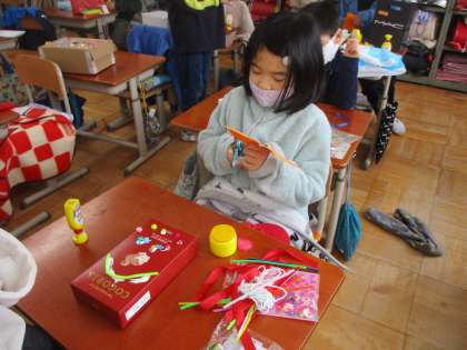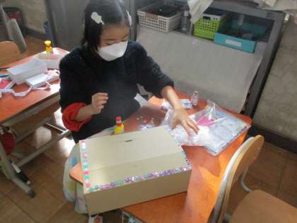 箱の中に入れたいものを考えて,飾りつけをする「かざってなにいれよう」の学習をしました。まずは,中に入れたいものを考えました。「きれいなもの」「たからもの」「貝殻」などの意見が出てきました。開けたら好きなものが入っている箱をイメージして,色や形を考えて飾り付けをしました。続きは木曜日です。