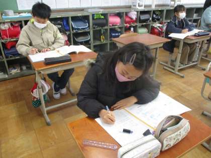 「直方体と立方体」の学習をしています。今回は,空間にあるものの位置は,どのように表せばよいかを考えました。応用問題に挑戦しています。