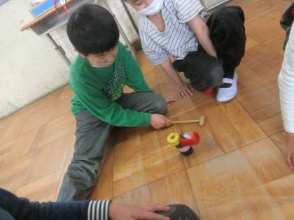 昔遊び体験をしています。今日はだるまおとしに挑戦しました。力加減が難しく,倒れてしまうことが多かったようです。班の中で励ましあいながら何度も練習しました。