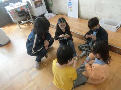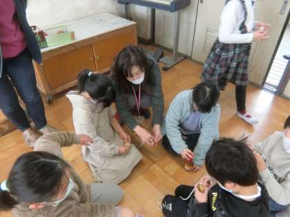 来週から挑戦する,こま回しに向けてひもの巻き方を練習しました。班の中で,方法を知っている子が,優しく教えました。また,教頭先生や事務員さんにも質問しながら巻きました。