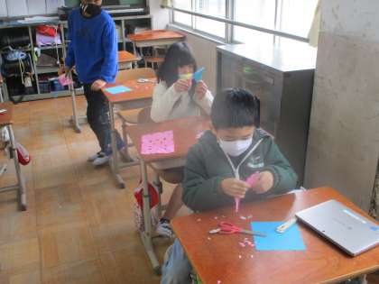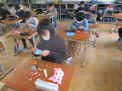 6年生の卒業をお祝いする飾りを作っている様子です。