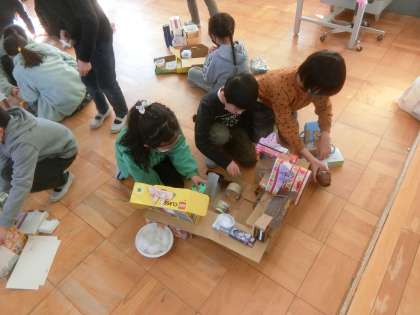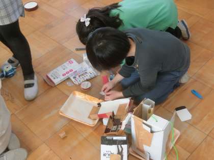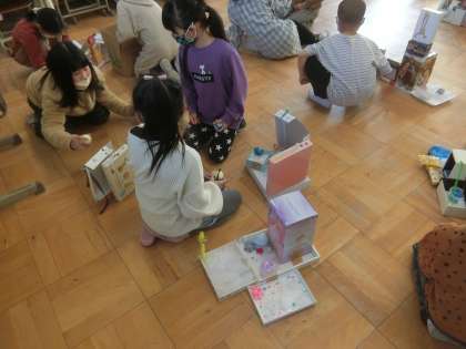 できあがった友達ハウスで,あそびました。他の友達にも自分が作った家を紹介し,遊びに来てもらう様子も見られました。ていねいにしあげることができました。