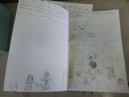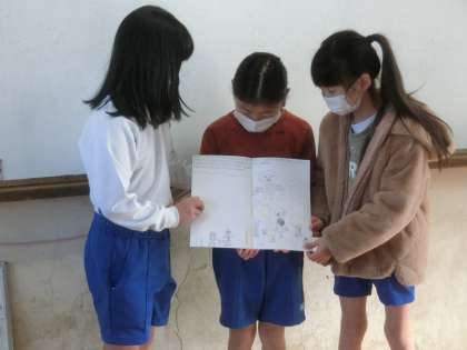 朝読書の時間に図書係が手作りの本を読みました。主人公が冒険をして,りんごを探す話でした。
