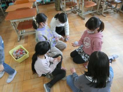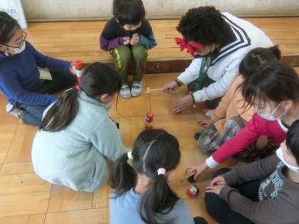 これまで練習してきた昔遊びで,アマダラ先生と遊びました。自分ができるようになったことを披露したり,教えあったりしました。