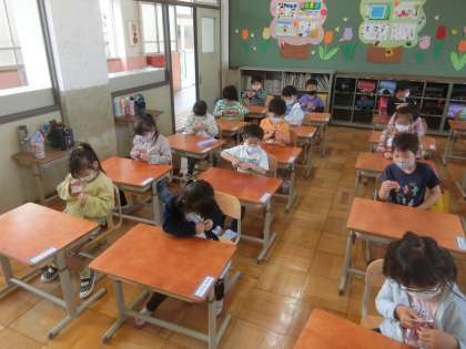 自分で,名札をつけたり,外したりする練習をしました。幼稚園の時にもやっていたという子もいて,上手に付け外しができました。明日は,登校後すぐに自分でつけられると,いいですね。