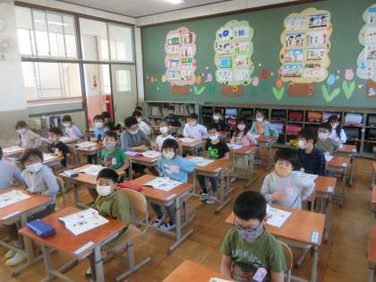 えんぴつの持ち方や姿勢の正し方を学びました。「足をペタ,背筋ピン,おなかとせなかにグーひとつ」の合言葉を唱えながら,練習しました。